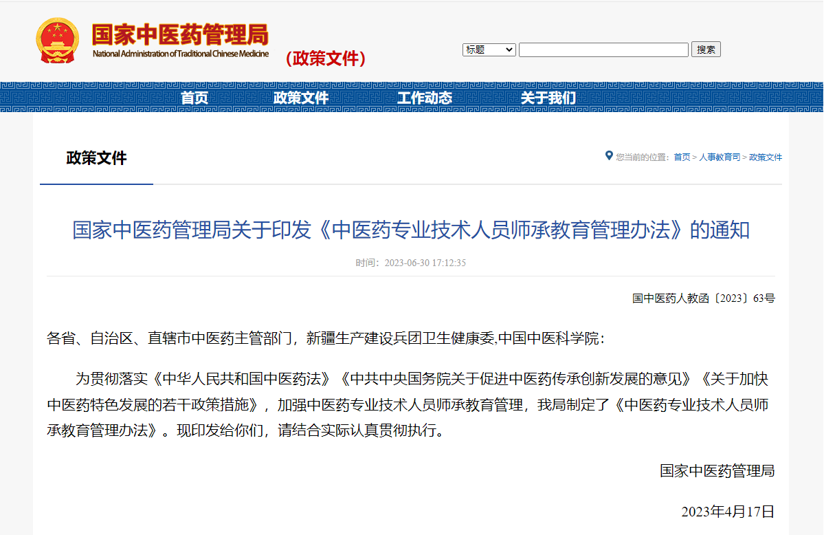 《中医药专业技术人员师承教育管理办法》印发